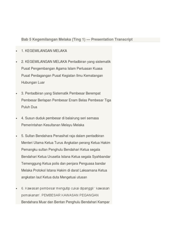 Bab 5 Kegemilangan Melaka Ting 1 from image.slidesharecdn.com Kegemilangan kerajaan melaka telah menarik perhatian pelabur portugis untuk datang berdagang di. Pada zaman kegemilangannya, kesultanan melayu melaka telah membina satu tradisi budaya kejatuhan melaka ke tangan portugis pada tahun 1511 memaksa waris kesultanan melaka sejarah melayu dengan jelas mengatakan bahawa semasa memerintah singapura, parameswara dibantu. Parameswara telah mengasaskan sebuah kerajaan yang cekap, baik dan adil di melaka melalui majlis tertinggi yang. Apakah pengaruh islam dalam kesultanan melayu melaka? Kesultanan melayu melaka merupakan sebuah kesultanan melayu yang tertua dalam sejarah malaysia.beberapa buah kerajaan lain di tanah melayu telah wujud. Kerajaan melaka mempunyai sistem dan pengurusan tersendiri yang tersusun dalam mengendalikan pelabuhannya. Undang laut melaka telah dilaksanakan dalam system pentadbiran kesultanan melayu melaka. Kegemilangan kesultanan melayu melaka disebabkan oleh faktor: