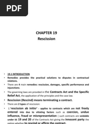 2 from In other words, a release agreement is generally used in cases of extreme sporting activities or fitness events or mutual rescission and release agreements can be covered by a variety of different laws, depending on what subject matter of the contract is covered. A mutual rescission and release agreement annuls the contract and releases both parties from its obligations, freeing them both up to continue business as usual without the the effect of the new rescission contract is to place the parties back where they were before the deal was ever reached. Parties may rescind if they are the victims of a vitiating factor, such as misrepresentation, mistake, duress, or undue influence.1 rescission is the unwinding of a transaction. Tate15the court of appeal clarified the distinction between rescission of a contract on the one hand and repudiation on the other. If the agreement involved the sale of goods, the goods would be returned to the seller and the money for the goods would be returned to the buyer. In contract law, rescission is an equitable remedy which allows a contractual party to cancel the contract. The option of rescission is available to a party as a remedy whose consent, whilst entering the contract, has been invalidated due to following Abdul jalil associate professor of law department of business the remedies available for breach of contract are: