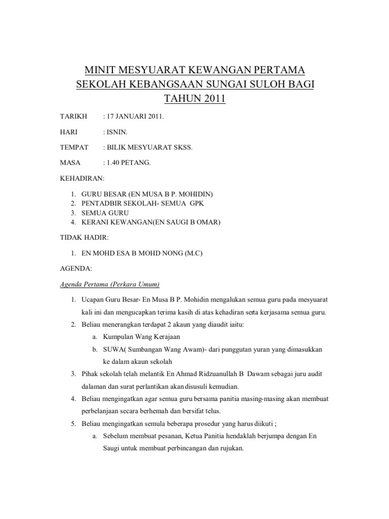 Minit Mesyuarat Ahli Lembaga Syarikat Kali Pertama 2012 from imgv2-2-f.scribdassets.com 638 x 826 jpeg 77 кб. Sebanyak 7 syarikat yang secara langsung berkaitan dengan cawangan pentadbiran telah dinilai dan dapat membekalkan barangan dan perkhidmatan sepertimana spesifikasi yang ditetapkan. Minit mesyuarat ajk persatuan bahasa melayu kali pertama 2014 sjk(c) ayer tawar tarikh : Jk keselamatan mencadangkan pengawal keselamatan swasta sentiasa diturunkan palang pagar sekolah dan mengenalpasti setiap inividu. Text of contoh minit mesyuarat ringkas. Ianya penting kerana minit merupakan sumber rujukan masa hadapan dimana pada kelazimannya format minit disusun mengikut agenda mesyuarat dan perlu kelihatan kemas. Senarai contoh minit mesyuarat sekolah. Untuk organisasi swasta, ia biasanya penting untuk minit untuk menjadi rapi dan hanya cukup.
